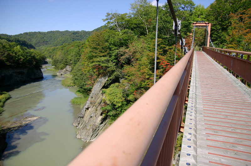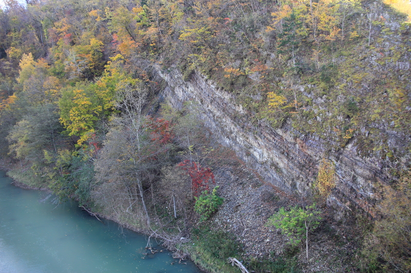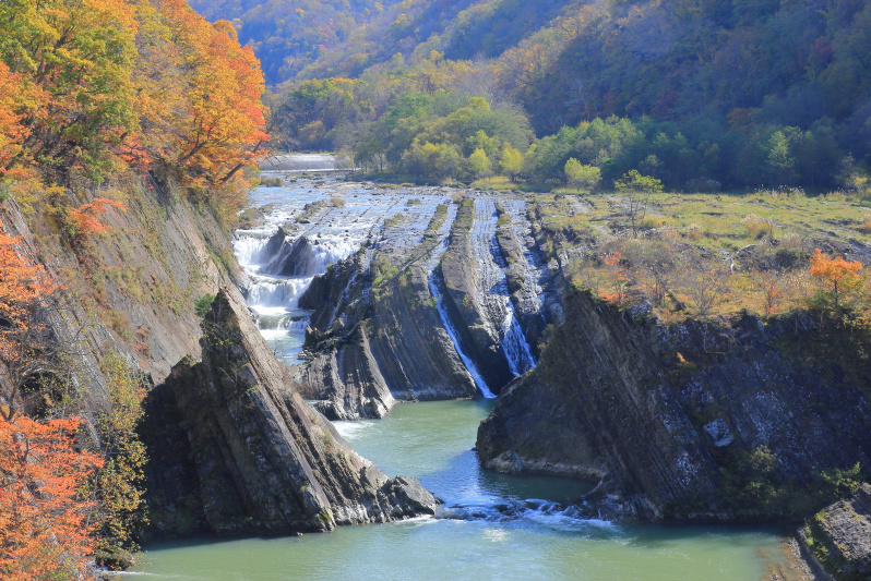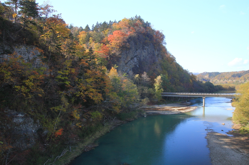 夕張市於兎牛(おそうし)の夕張川にかかる滝の上橋の左岸は、崖が続き於兎牛沢川が合流する場所には小さく落差もさほどなく地図に名前もないが美しい滝がある。左岸には落差約75mの崖がそびえ立つ。(2018年10月22日撮影)
