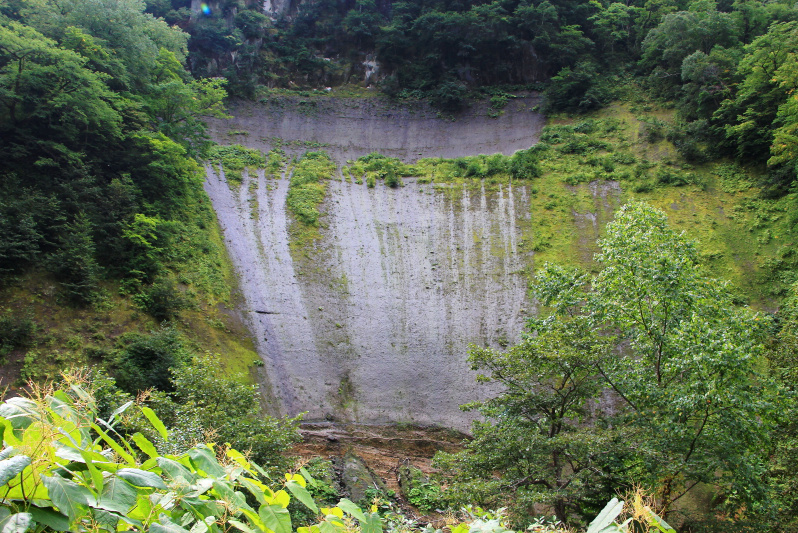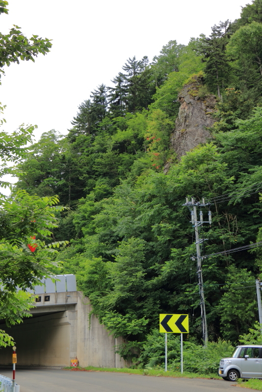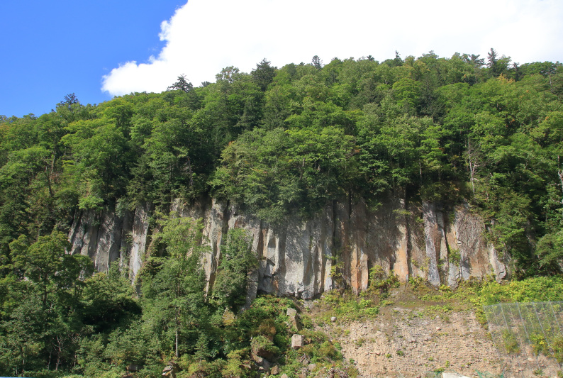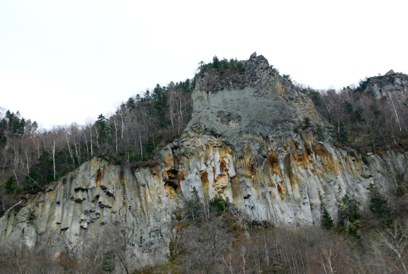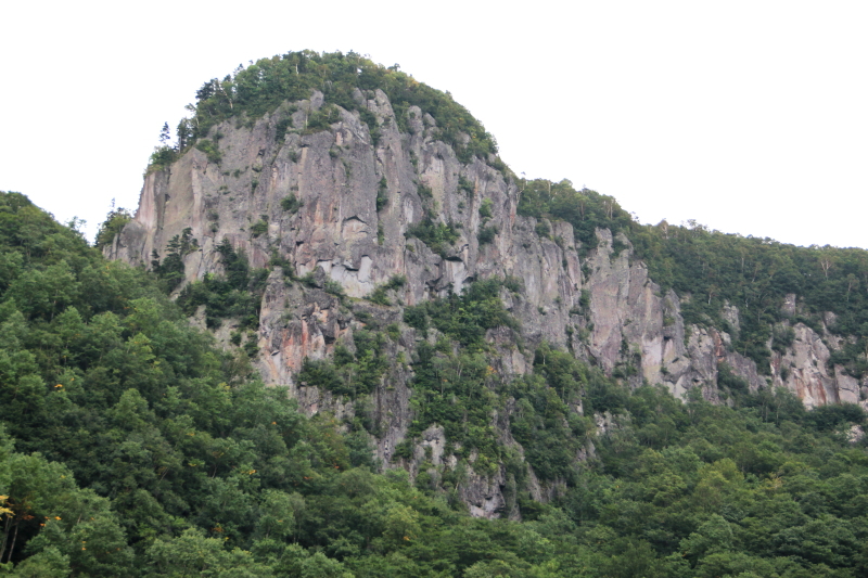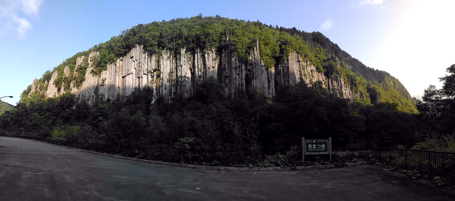天女が羽衣をなくし、自分の国へ飛んで帰れなくなり困って泣いていた涙が今だにこの岩に流れております。(羽衣伝説の一説より)この巨大な一枚岩は約3万年前に旭岳にあるお鉢平が噴火して流れてきた火砕流が堆積したものである(東川町パンフレットより)高さ約50m。(2019年9月10日撮影)