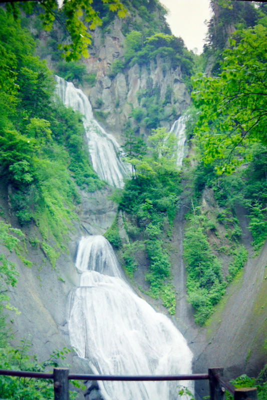 この展望台からの長めは土砂崩れにより見ることができなくなった。遊歩道整備後は滝から流れ落ちた川の対岸から見ることになり、右から流れ落ちる滝は見えなくなっている。(1991年7月フィルム撮影)