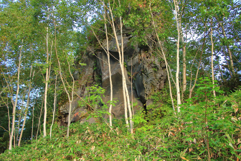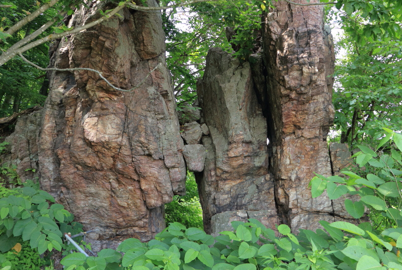 車を停められるところから山道を歩いて十数分、和寒の街を見下ろす山の上に二つの岩がそびえ立つ。(2020年7月5日撮影)