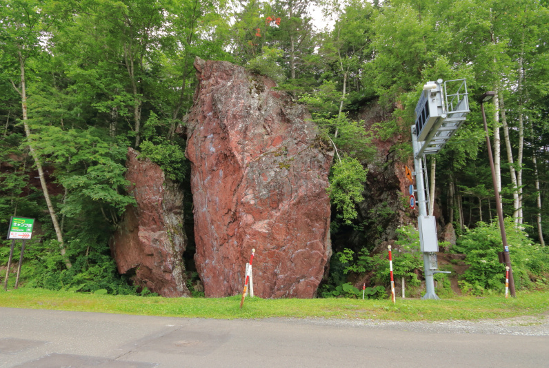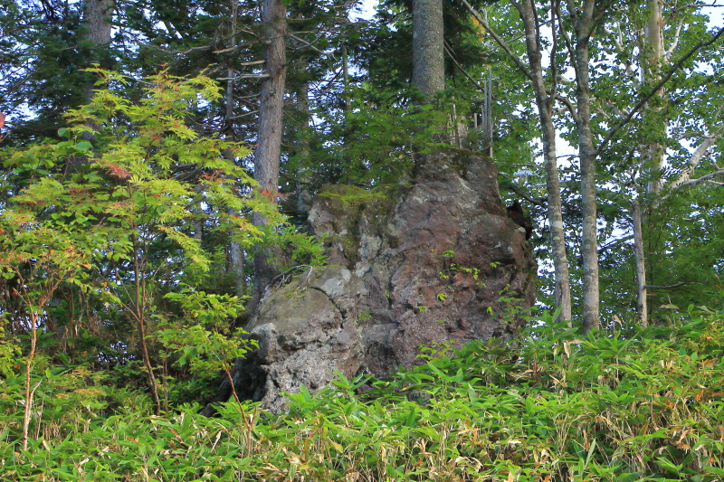 旭岳温泉街の手前左側駐車帯に「ガマ岩」の案内板。車を降りて見上げると巨大な岩がドン!と座っている。白樺に囲まれて見えづらいが巨岩という事は分かっていただけると思う。(2019年9月10日撮影)