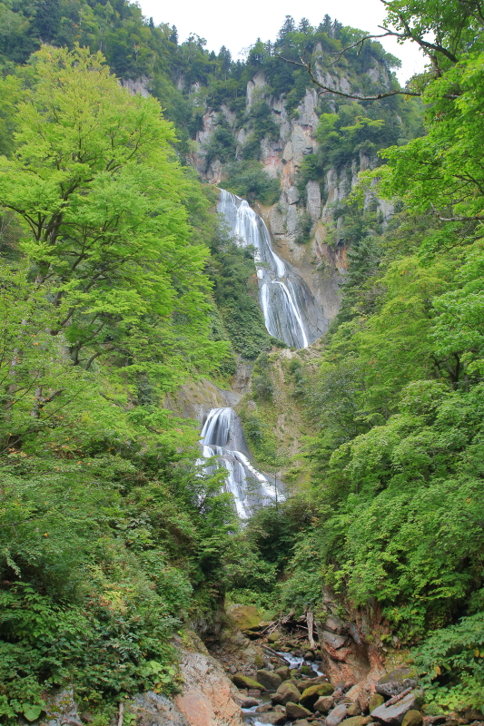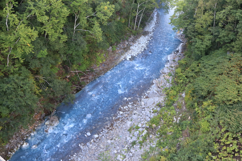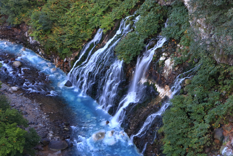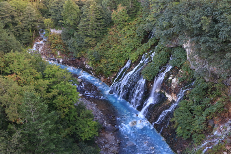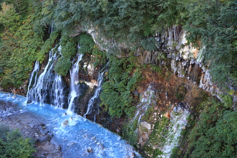 落差30m。ブルーリバー橋から一望できる。岩の間から流れ落ちる地下水はコバルトブルーの美瑛川に注ぎ込む。(2019年9月10日撮影)