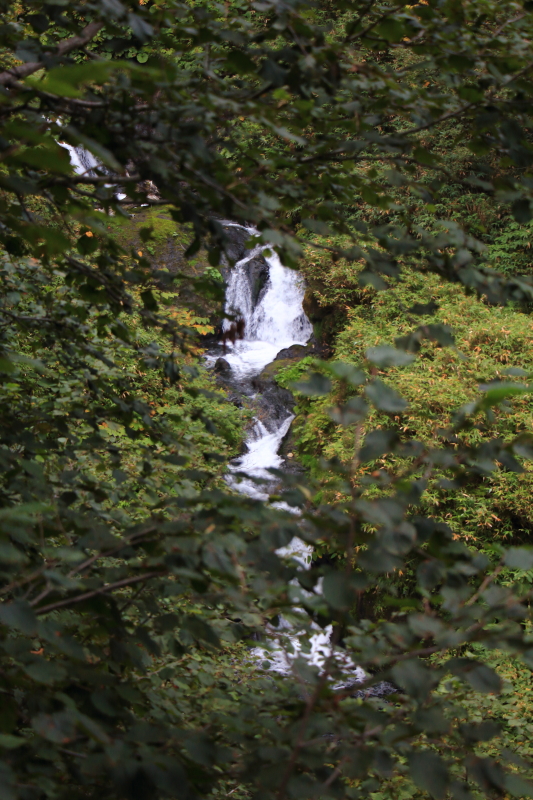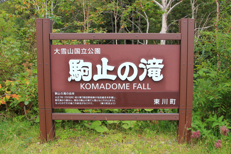 旭岳温泉街手前の駐車場より徒歩数分で滝の見える場所に着くが、木が生い茂ってわずかに見えるのみである。右手に踏み分けられた小道があり、川沿いまで降りてみたが木が邪魔して滝を見ることはできない。駒止の滝の由来として、旭川師団が駒止の滝で人馬とも行き止まりとなったのでこの命名がなされた。とあるがこれでは由来にならないのでは?(2019年9月10日撮影)