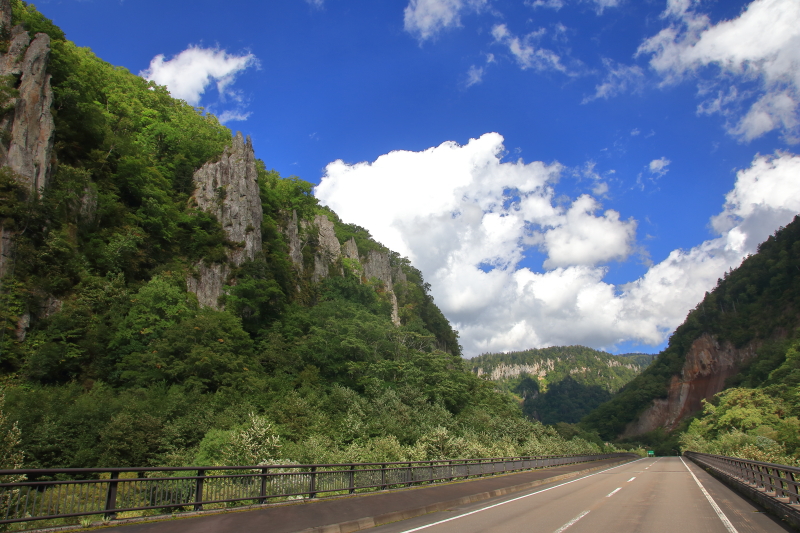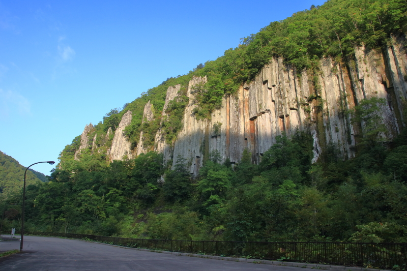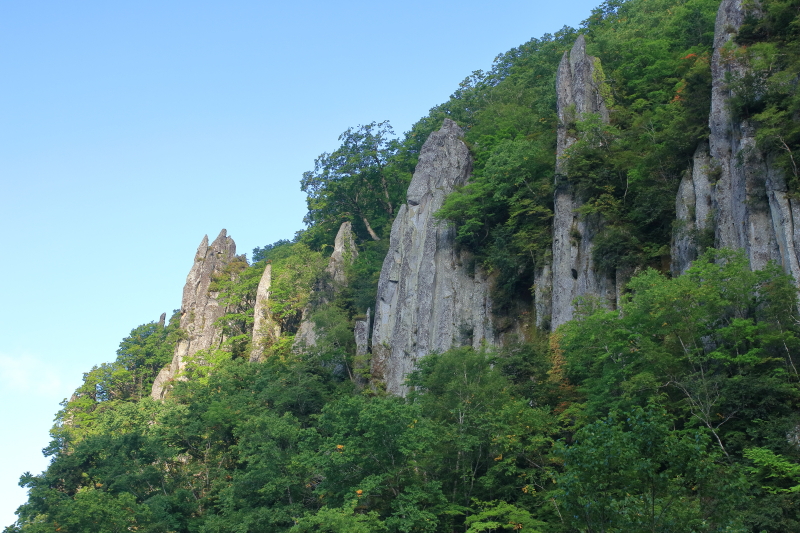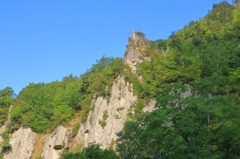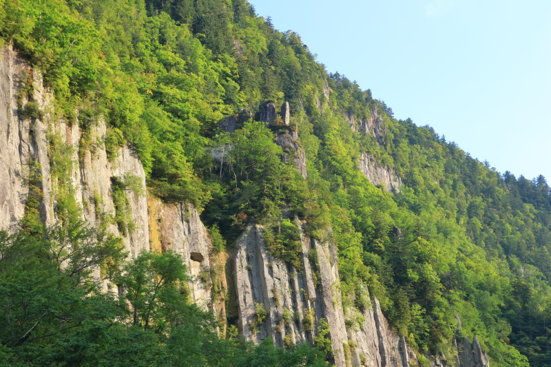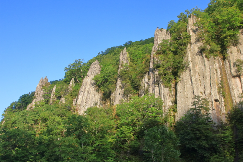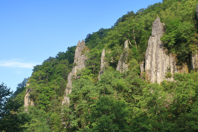 尖った柱状節理7本が天に向かってそびえ立っている。羽衣トンネルと天人峡トンネル間の駐車場から清流橋にかけてが良く見える。(2019年9月10日撮影)