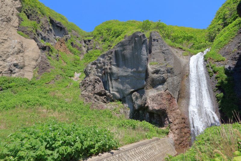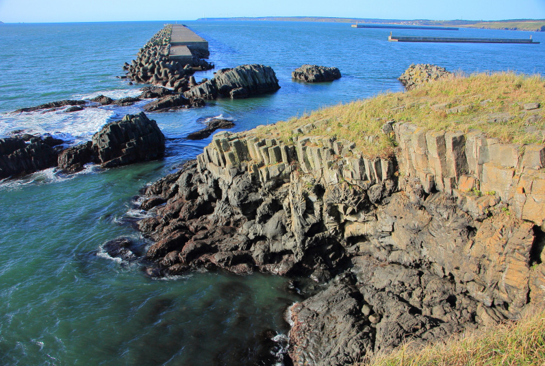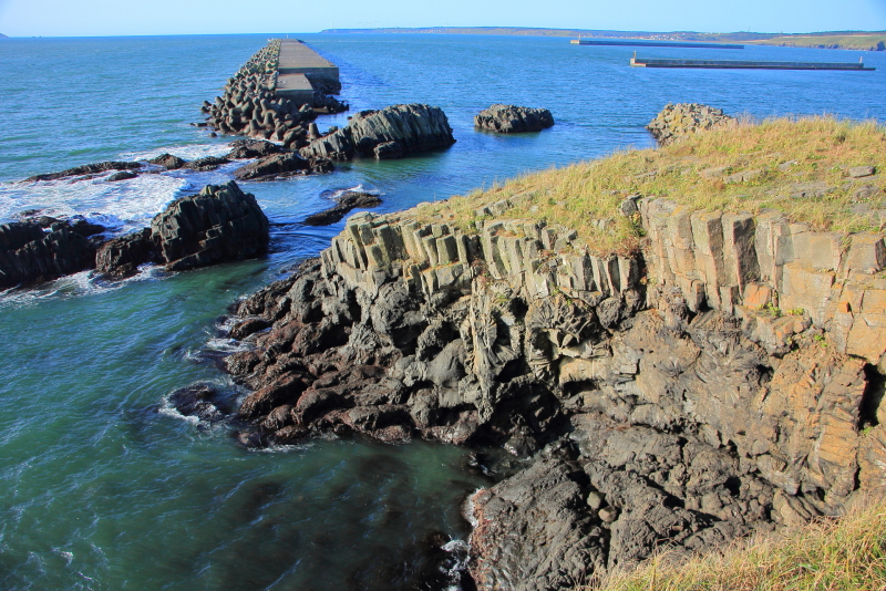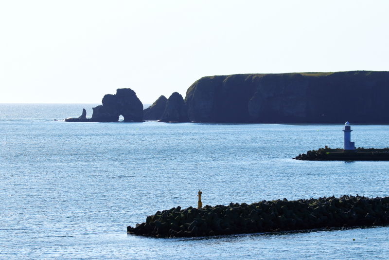 落石漁港から見える眼鏡岩近くには取り付けなさそうで、港の上から見るとちょうど穴も見えて良いと思われる。(2020年9月29日撮影)