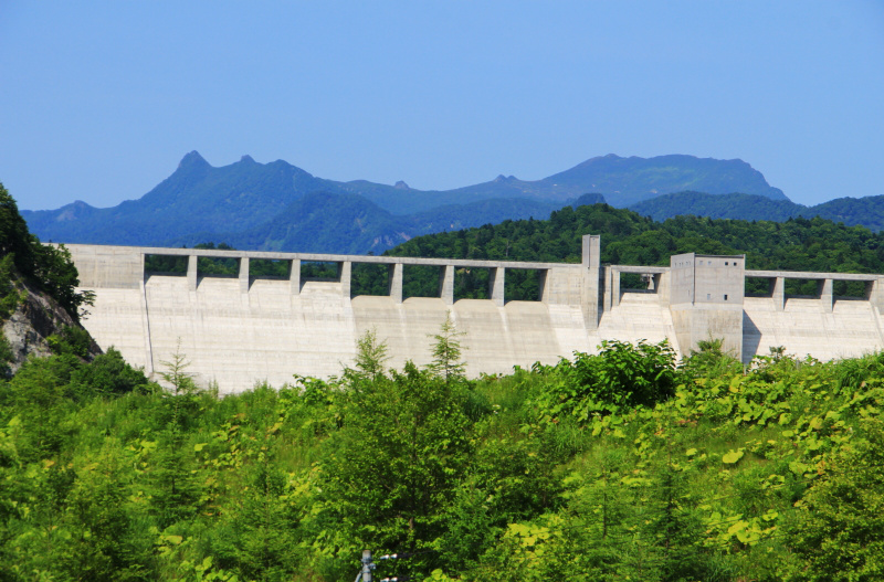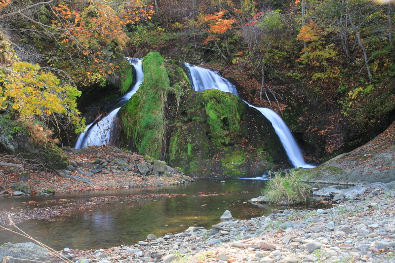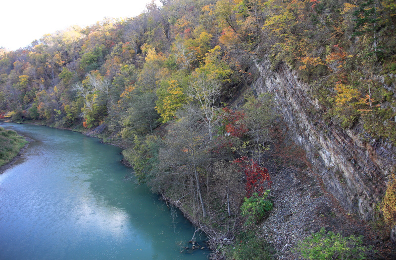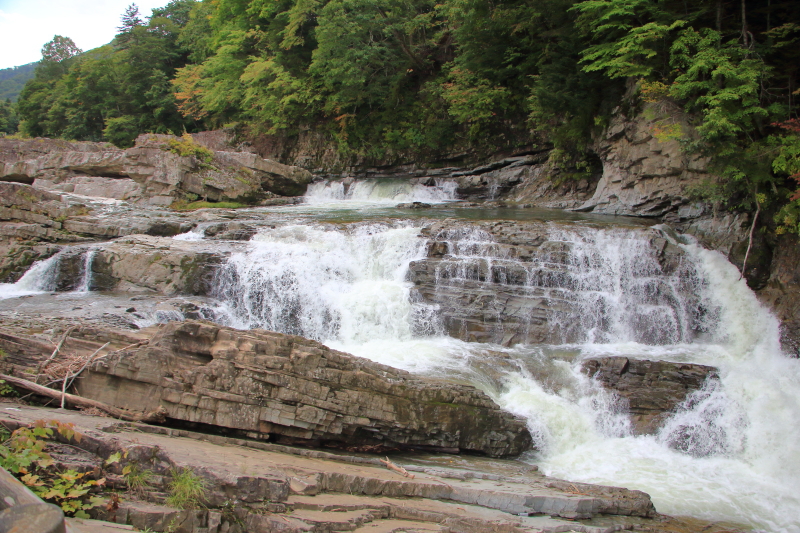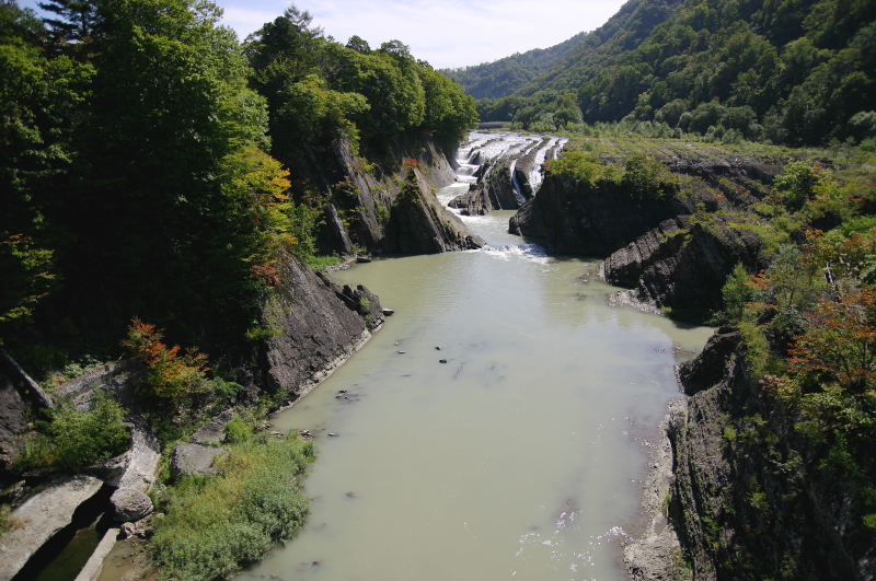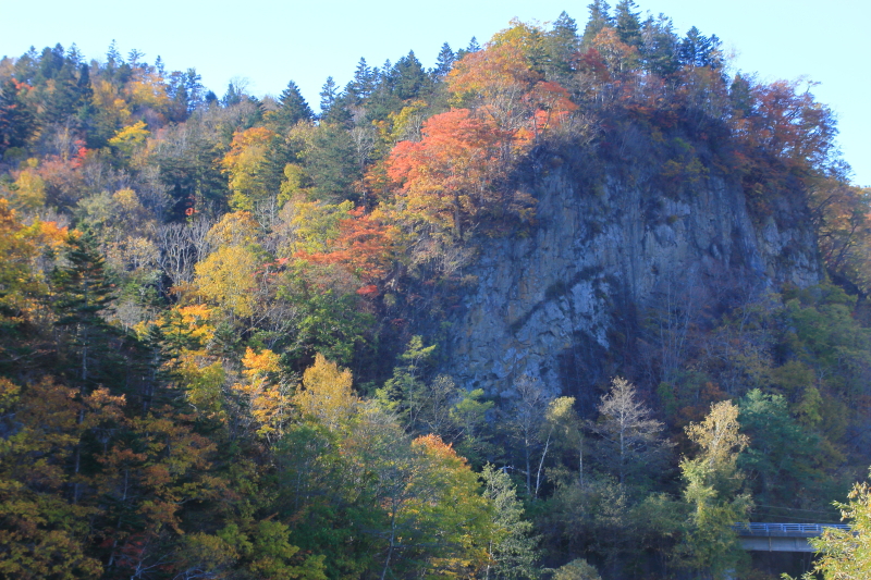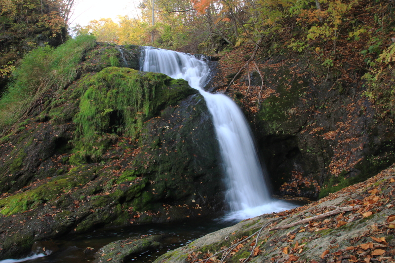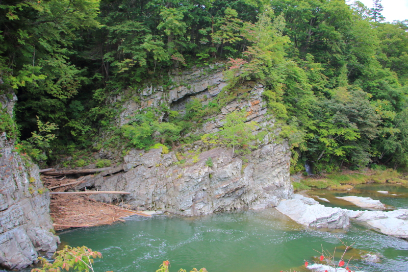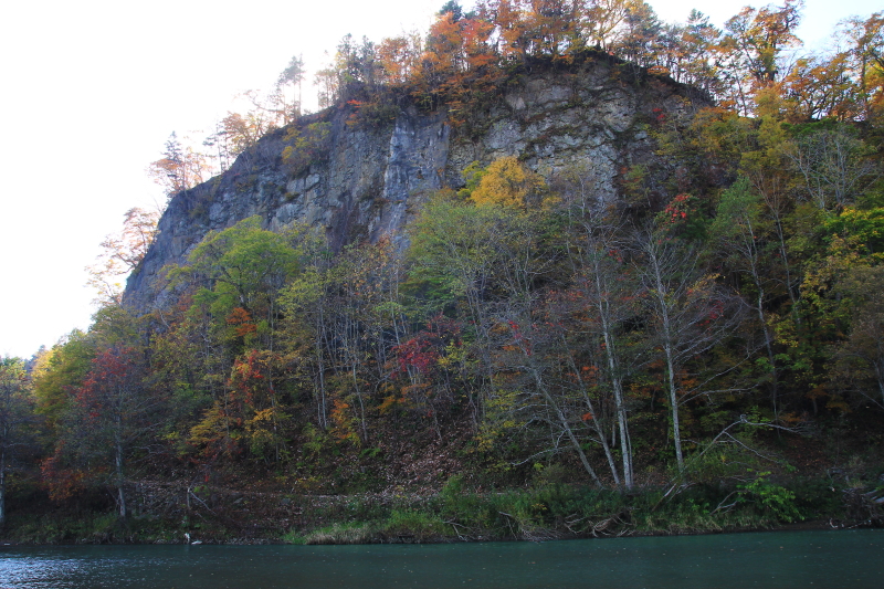 夕張市於兎牛(おそうし)の夕張川にかかる滝の上橋の左岸は、崖が続き於兎牛沢川が合流する場所には小さく落差もさほどなく地図に名前もないが美しい滝がある。左岸には落差約75mの崖がそびえ立つ。(2018年10月22日撮影)