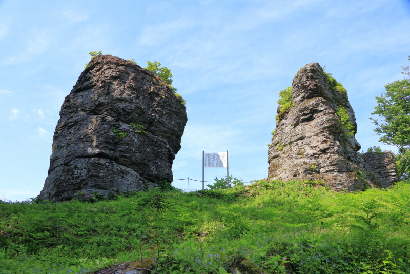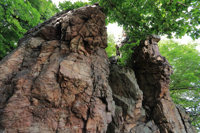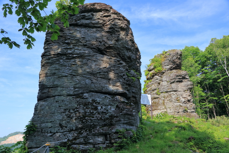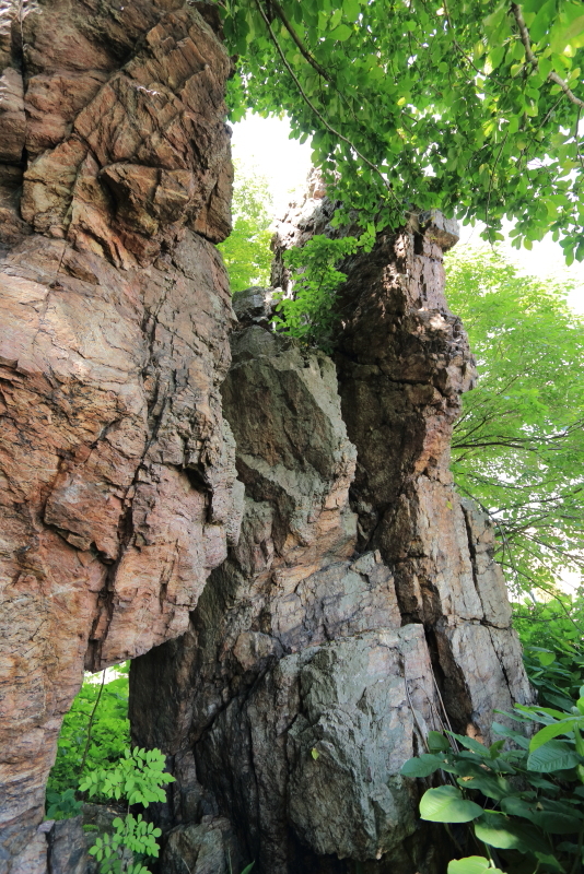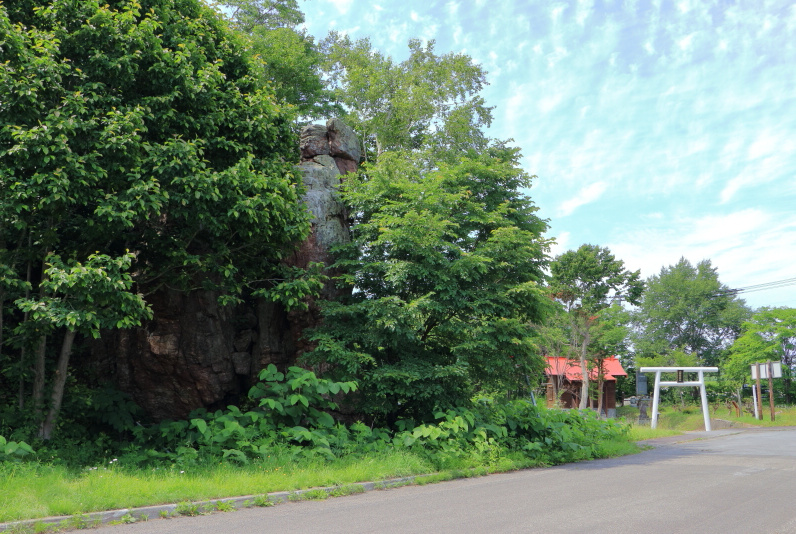 車を停められるところから山道を歩いて十数分、和寒の街を見下ろす山の上に二つの岩がそびえ立つ。(2020年7月5日撮影)
