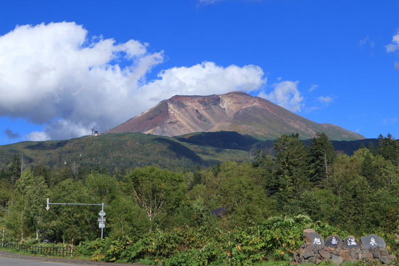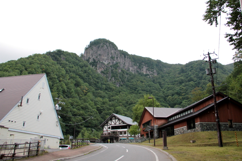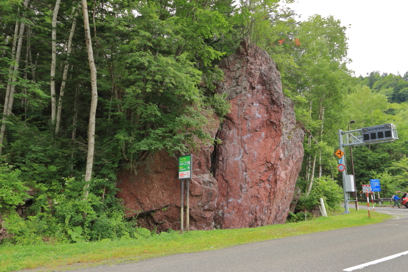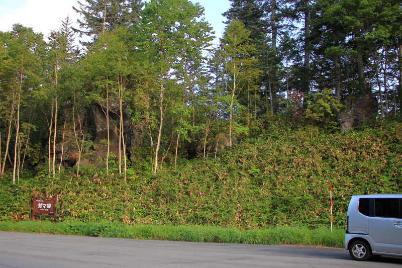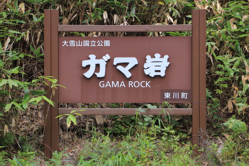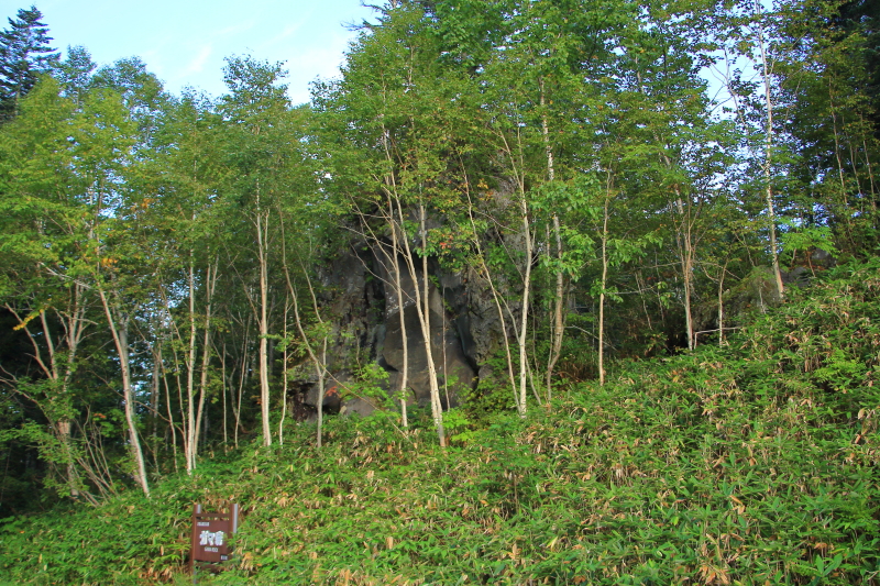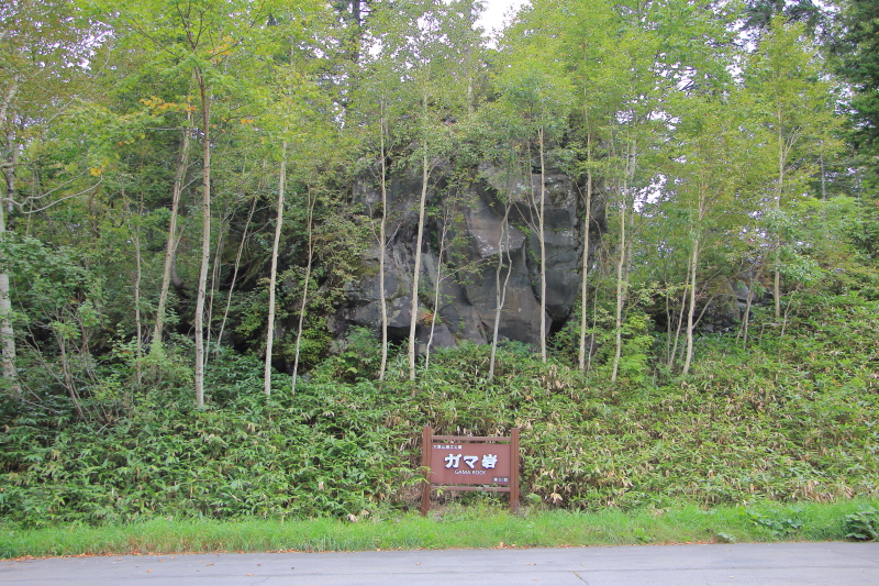 旭岳温泉街の手前左側駐車帯に「ガマ岩」の案内板。車を降りて見上げると巨大な岩がドン!と座っている。白樺に囲まれて見えづらいが巨岩という事は分かっていただけると思う。(2019年9月10日撮影)