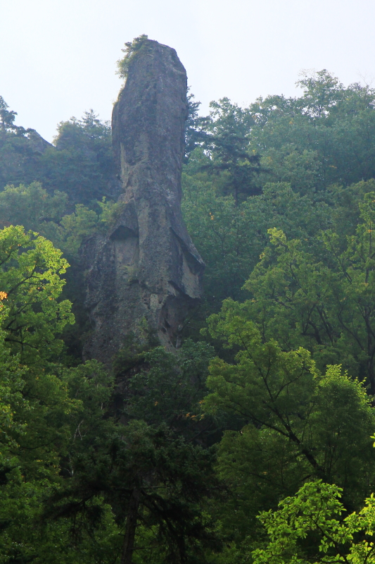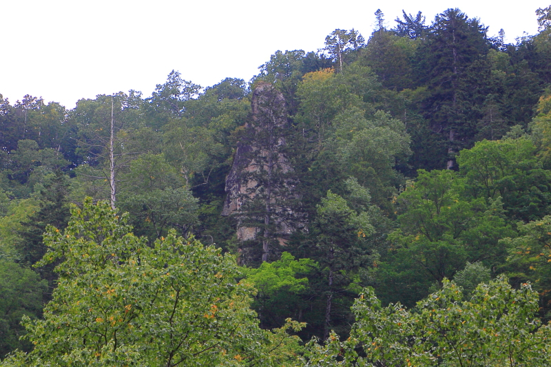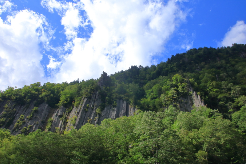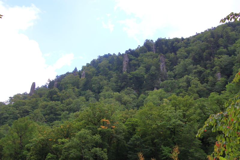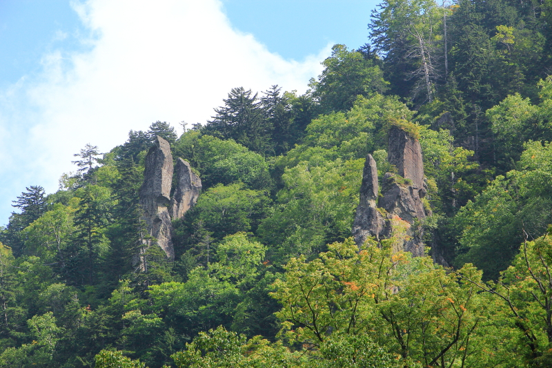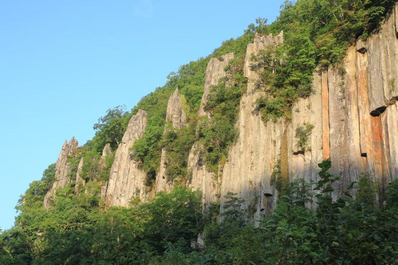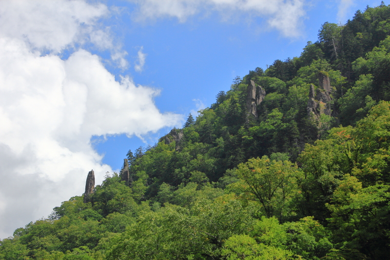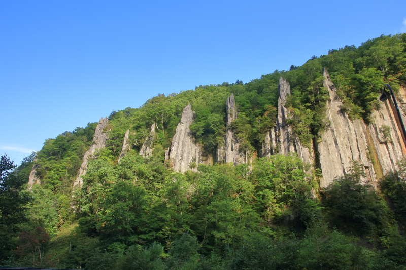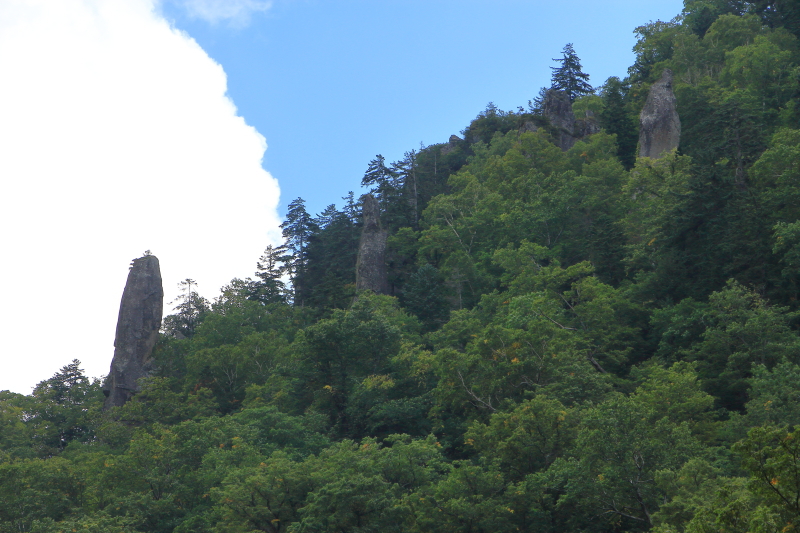 尖った柱状節理7本が天に向かってそびえ立っている。羽衣トンネルと天人峡トンネル間の駐車場から清流橋にかけてが良く見える。(2019年9月10日撮影)