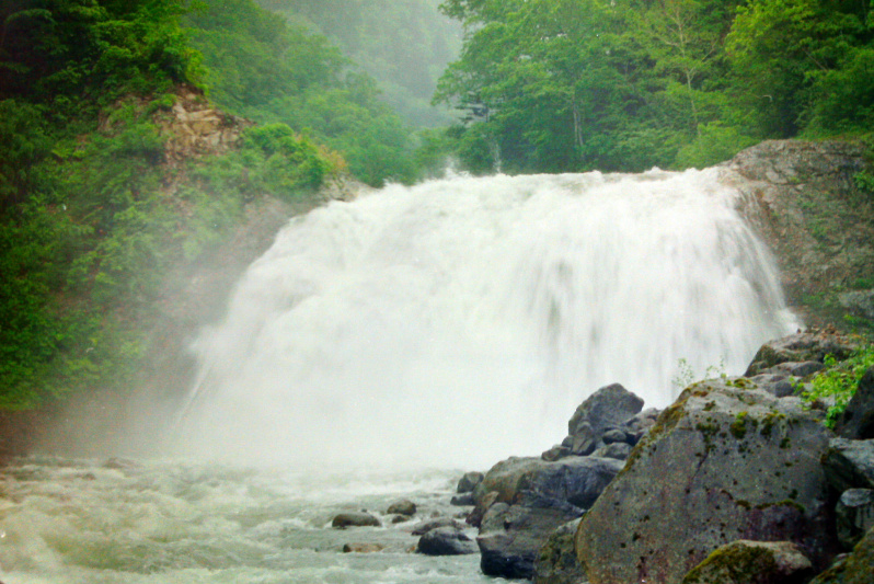 この展望台からの長めは土砂崩れにより見ることができなくなった。遊歩道整備後は滝から流れ落ちた川の対岸から見ることになり、右から流れ落ちる滝は見えなくなっている。(1991年7月フィルム撮影)