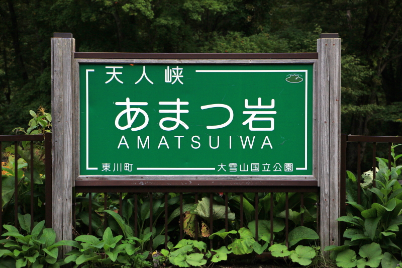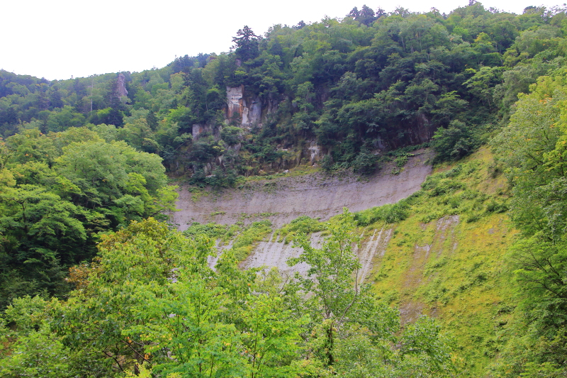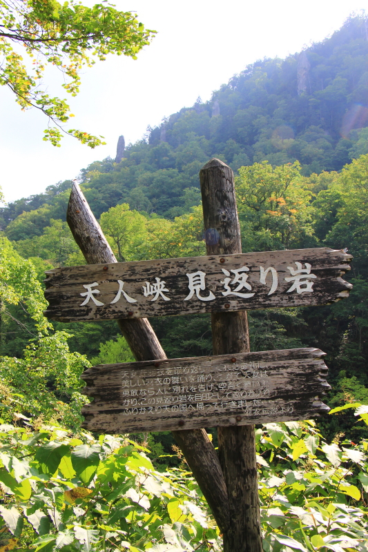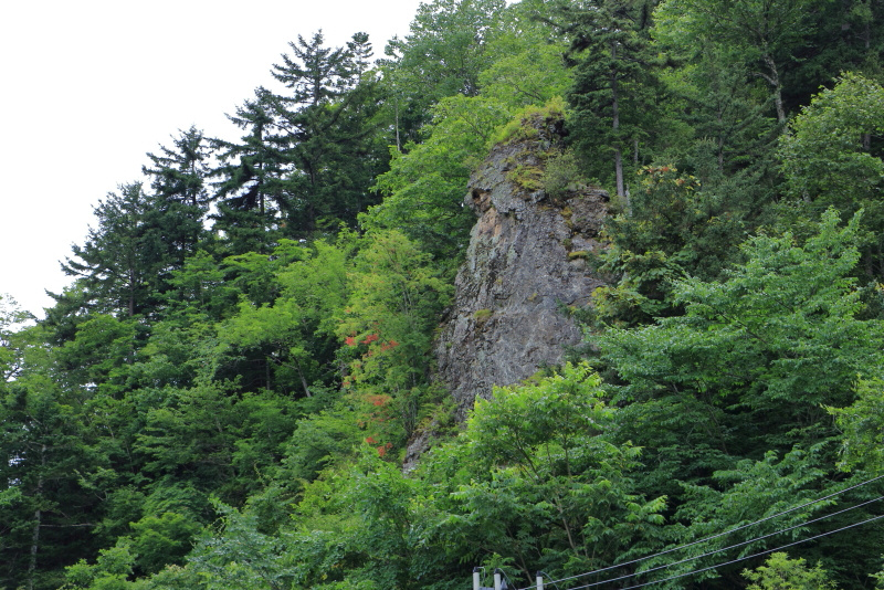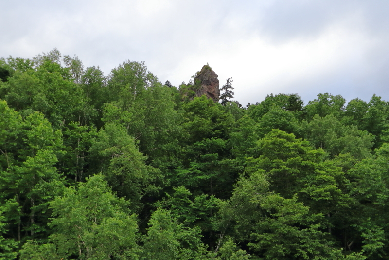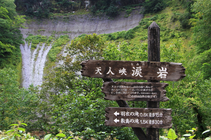 天女が羽衣をなくし、自分の国へ飛んで帰れなくなり困って泣いていた涙が今だにこの岩に流れております。(羽衣伝説の一説より)この巨大な一枚岩は約3万年前に旭岳にあるお鉢平が噴火して流れてきた火砕流が堆積したものである(東川町パンフレットより)高さ約50m。(2019年9月10日撮影)