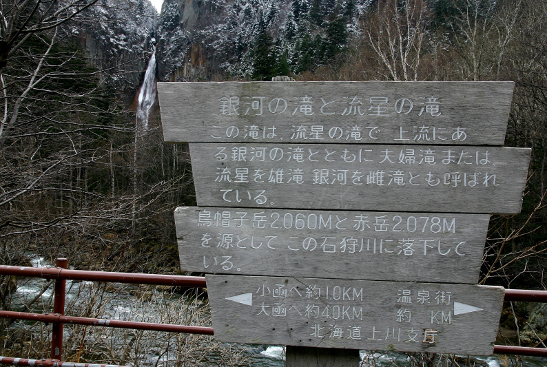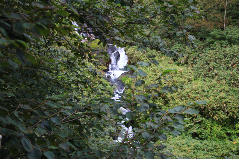 旭岳温泉街手前の駐車場より徒歩数分で滝の見える場所に着くが、木が生い茂ってわずかに見えるのみである。右手に踏み分けられた小道があり、川沿いまで降りてみたが木が邪魔して滝を見ることはできない。駒止の滝の由来として、旭川師団が駒止の滝で人馬とも行き止まりとなったのでこの命名がなされた。とあるがこれでは由来にならないのでは?(2019年9月10日撮影)