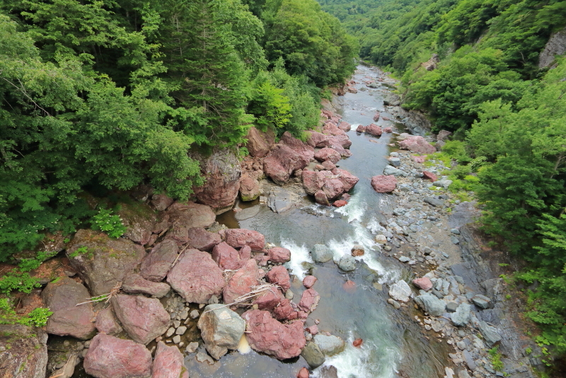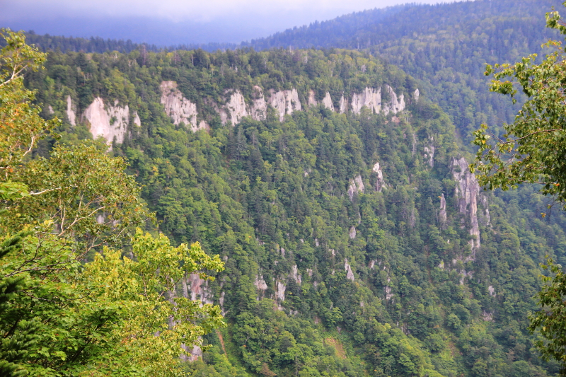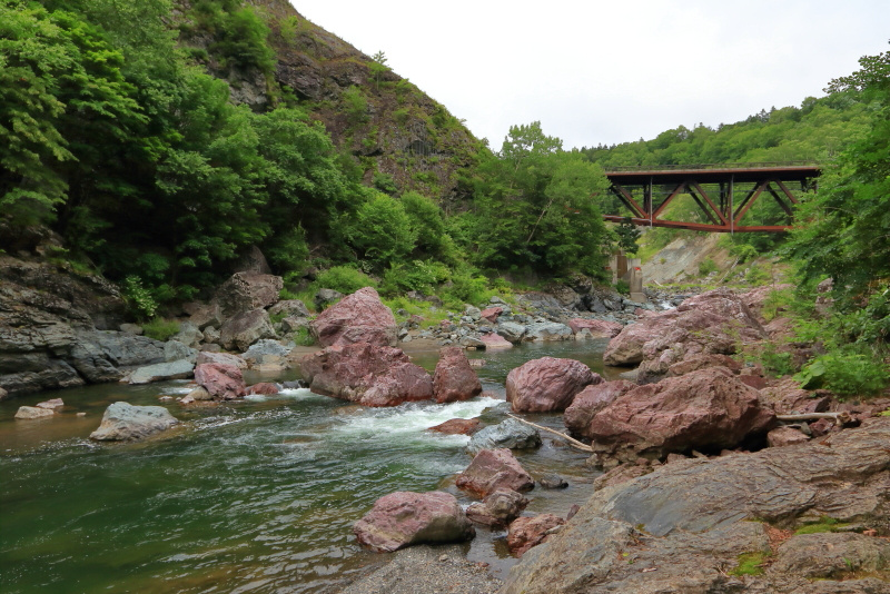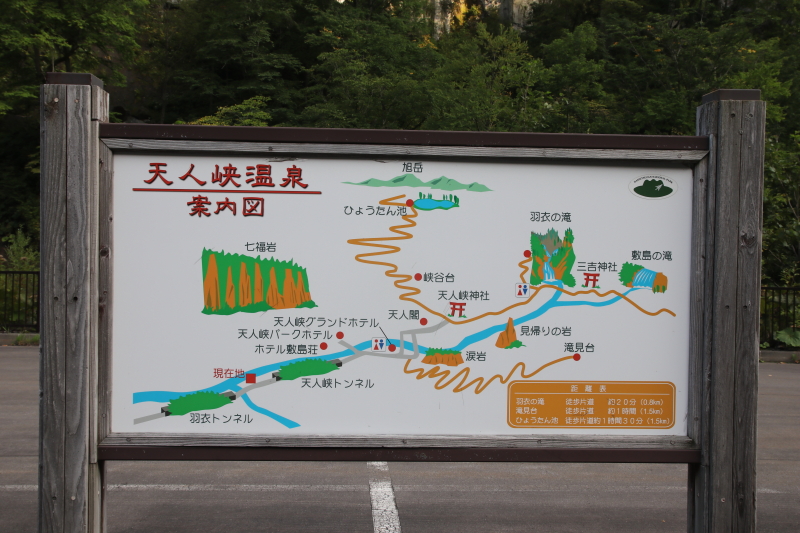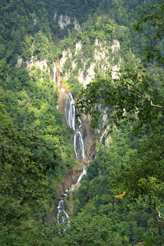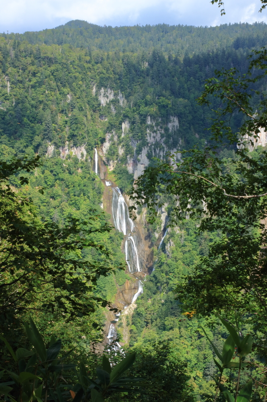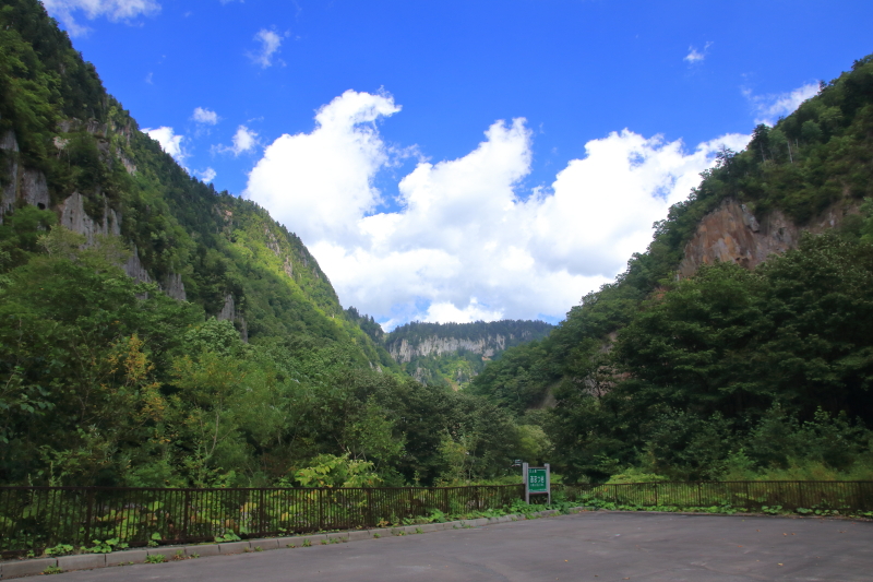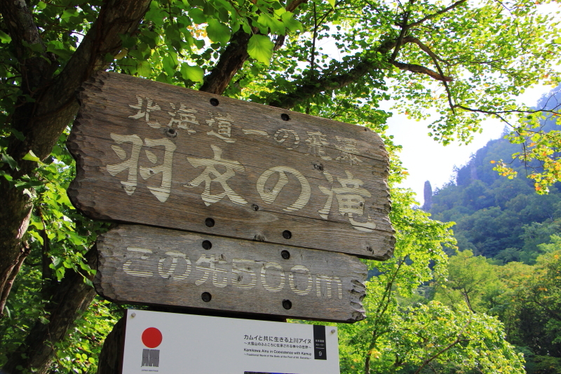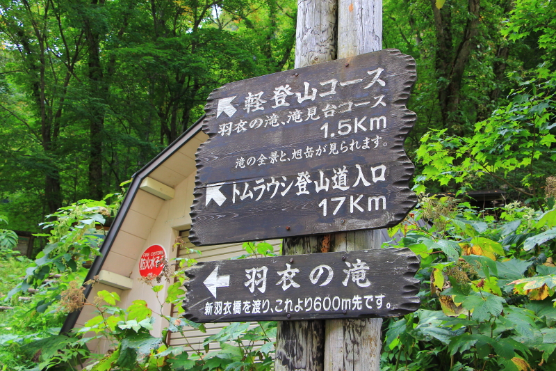 トムラウシ山への登山口にもなっている滝見台は、橋の手前から約1時間から1時間半で登れるが、ほとんどが急な坂道になっており、倒木も多いのである程度の覚悟は必要だ。天気が良ければ眼下に羽衣の滝と旭岳が一度に見られる。敷島の滝も見られるというが、かなり小さくしか見ることはできないが、忠別川の上部の渓谷は見ごたえがある。(2019年9月10日撮影)