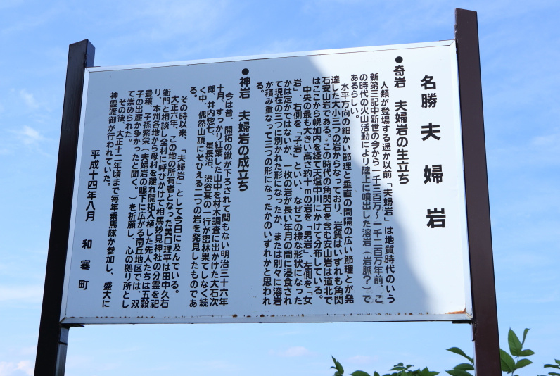 天女は浴衣を取り返してくれたお礼に、美しい羽衣の舞いを踊り、やがて天女は勇敢な弓人に別れを告げ、空高く舞い上がり、この見返り岩を目印としてふりかえりふりかえり天の国へ帰って行きました。(羽衣伝説より)案内板には見返り岩と書かれてあるが、地理院地図やガイドマップには見返り”の”岩となっているので”の”と付けて表示した。(2019年9月10日撮影)